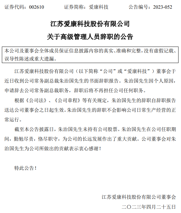 4月24日,愛康科技(002610.SZ)發(fā)布公告稱:董事會(huì)于近日收到公司常務(wù)副總裁朱治國先生的書面辭職報(bào)告。朱治國先生因個(gè)人原因,申請辭去公司常務(wù)副總裁職務(wù),辭職后將不再擔(dān)任公司任何職務(wù)。