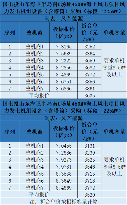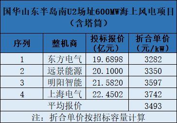 上次行業(yè)刷新低價(jià)是在國家能源集團(tuán)國華投資山東半島南U2場(chǎng)址600MW海上風(fēng)機(jī)(含塔筒)采購項(xiàng)目。該項(xiàng)目共有4家整機(jī)商競(jìng)標(biāo),其中東方電氣報(bào)價(jià)最低,投標(biāo)報(bào)價(jià)為19.69億元,折合單價(jià)為3282元/kW。