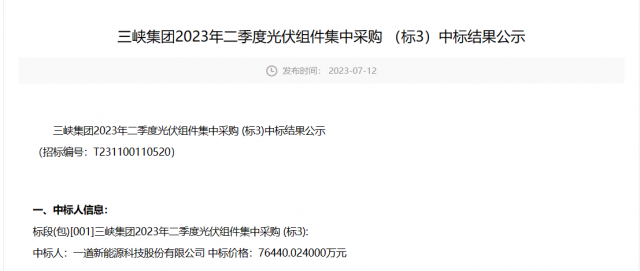 7月28日,三峽2023年二季度光伏組件集中采購(gòu)(標(biāo)1)中標(biāo)結(jié)果公示,通威以1.3元/瓦的報(bào)價(jià)獨(dú)享2249.4MW的光伏組件訂單,組件型號(hào)為P型545W+雙面。