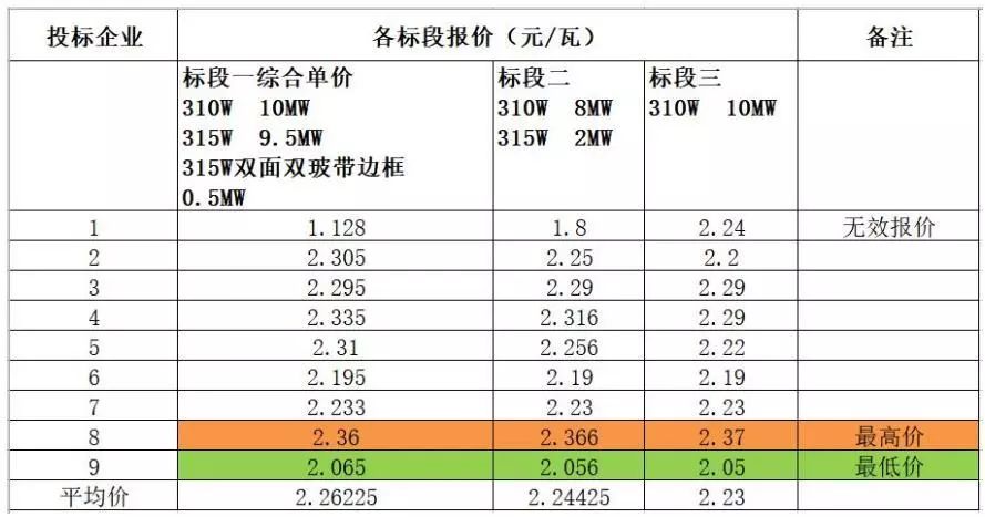 從開標價格可以看出,除去無效報價,三個標段的最低價格為2.05元/瓦,最高報價為2.37元/瓦,平均價格集中在2.2-2.3元/瓦。