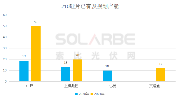 通過梳理現有以及規(guī)劃中的210產能,索比光伏網發(fā)現,2020年底中環(huán)、上機數控、協(xié)鑫三家的210硅片產能已達42GW,2021年210硅片產能規(guī)劃已超92GW。由此看來,2021年210大尺寸硅片迭代速度將超乎預期。
