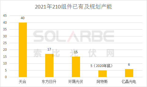 電池片端,通威、天合、愛旭、東方日升四家企業(yè)2021年的210電池片產能規(guī)劃超61GW。