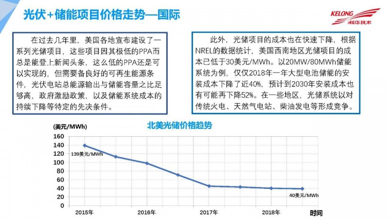 2021年2月3日,由中國光伏行業(yè)協(xié)會主辦的“光伏行業(yè)2020年發(fā)展回顧與2021年形勢展望網(wǎng)絡(luò)研討會”上,科華數(shù)據(jù)股份有限公司新能源事業(yè)部副總經(jīng)理曹建從多方面介紹了我國目前光伏+儲能行業(yè)的最新情況以及未來展望。曹建總經(jīng)理表示,未來中國的能源發(fā)展將會經(jīng)歷從高碳到低碳再到零碳的重要階段,光伏未來將在我國發(fā)電體系中占比越來越高。儲能能夠較好的降低光伏發(fā)電成本,全球角度來看,儲能項目在五年的時間內(nèi)降低了近4倍。未來光伏+儲能將創(chuàng)造更多更加安全可靠的光伏發(fā)電場景,同時其具備快速響應(yīng)電網(wǎng)調(diào)頻等眾多優(yōu)勢,將是未來新能源電力市場發(fā)展的必然趨勢之一。