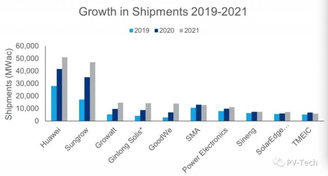 根據(jù)Wood Mackenzie排名,華為和陽光電源連續(xù)第七年繼續(xù)領(lǐng)先,分別占據(jù)第一和第二的位置。2021年,華為的市場份額保持在穩(wěn)定的23%,陽光電源緊隨其后,從2020年的約19%增至約21%。