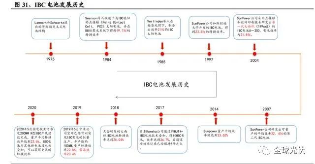 IBC 電池發(fā)展歷史:IBC 電池早最是由 Lammert 和 Schwartz 在 1975 年提出 的背面指交叉式電池結(jié)構(gòu)。美國(guó)的 Sunpower 公司是 IBC 電池的領(lǐng)軍者和開拓者, 2014 年其量產(chǎn)平均效率就達(dá)到 23.62%,2015 年實(shí)驗(yàn)室效率達(dá)到 25.2%;2018 年 天合研發(fā)的大面積 IBC 電池轉(zhuǎn)換效率達(dá)到 25.04%;2019 年 5 月中來公司宣布已 經(jīng)可以實(shí)現(xiàn) IBC 電池的批量生產(chǎn),年產(chǎn)能約 150MW,量產(chǎn)轉(zhuǎn)換效率 22.8%,最高效率 23.4%。2020 年 5 月國(guó)電投黃河水電 200MW N 型 IBC 產(chǎn)線建設(shè)完成,量產(chǎn)平均轉(zhuǎn)換效率達(dá)到 23.6%。IBC 電池與其他新電池技術(shù)相疊加,可以獲得更高的 轉(zhuǎn)換效率,2017 年 3 月,日本 Kaneka 公司通過將 HJT 和 IBC 電池技術(shù)疊加,得 到 HBC 電池,效率達(dá)到 26.7%,目前這項(xiàng)效率記錄已經(jīng)保持 5 年之久。