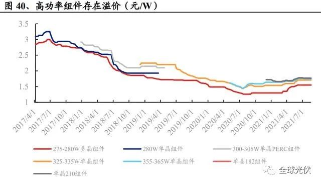 從最終組件端綜合成本來看,當(dāng)前 P-IBC 電池已經(jīng)具備成本優(yōu)勢(shì),TOPcon 成本較 PERC 稍高,HJT 電池成本還需進(jìn)一步下降。溢價(jià):TOPcon 高效組件產(chǎn)品溢價(jià)約為 0.1 元/W。新型產(chǎn)品性價(jià)比除了考慮 絕對(duì)成本優(yōu)勢(shì)外,還需考慮高功率溢價(jià)優(yōu)勢(shì)。參考PVinfolink數(shù)據(jù),2017-2020年 間,單晶組件相對(duì)于多晶組件長(zhǎng)期保持 8%-10%的價(jià)格溢價(jià),大尺寸(182及 210) 高功率組件產(chǎn)品相對(duì)于常規(guī)功率組件也能保持一定溢價(jià)。
