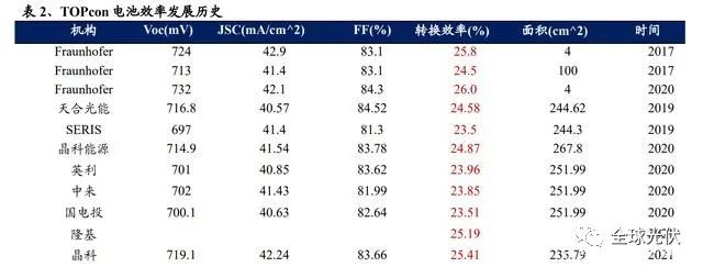 發(fā)展歷史:2013 年德國(guó) Fraunhofer 研究所在 N 型 PERT 結(jié)構(gòu)基礎(chǔ)上,首次提 出 TOPCon 結(jié)構(gòu);2017 年 Fraunhofer 研究所在實(shí)驗(yàn)室 TOPcon 電池上取得 25.8% 的效率記錄;2019 年,天合光能在面積為 244.62 平方厘米的 n 型襯底上制備出 正面最高效率為 24.58%的實(shí)驗(yàn)室電池,并獲德國(guó)哈梅林太陽能研究所(ISFH) 下屬的檢測(cè)實(shí)驗(yàn)室認(rèn)證,同年,天合光能 i-TOPCon 雙面電池大規(guī)模量產(chǎn)正面平 均轉(zhuǎn)換效率突破 23%。2021 年,晶科能源 TOPcon 電池在權(quán)威第三方測(cè)試認(rèn)證機(jī) 構(gòu)日本 JET 檢測(cè)實(shí)驗(yàn)室標(biāo)定全面積電池最高轉(zhuǎn)化效率達(dá)到 25.4%,成為商業(yè)化全 面積電池效率記錄的保持者,為后續(xù)的 N 型 TOPCon 電池的擴(kuò)產(chǎn)奠定基礎(chǔ)。