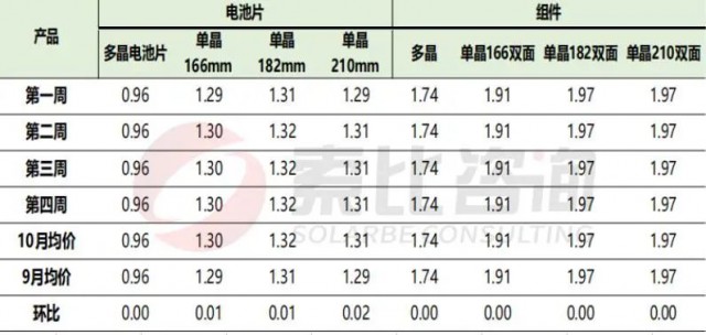 根據(jù)索比咨詢對(duì)多家組件制造商的調(diào)研:就10月組件價(jià)格行情來看,單晶166雙面均價(jià)1.91元/W,較9月環(huán)比持平;單晶182雙面均價(jià)1.97元/W,較9月環(huán)比持平;單晶210雙面均價(jià)1.97元/W,較9月環(huán)比持平。