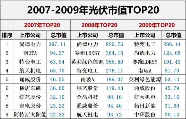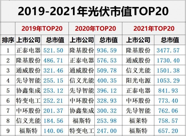 2005年以后,隨著無錫尚德、江西賽維、天合光能、阿特斯、晶科、晶澳等一眾中國光伏企業(yè)成功搶灘美國資本市場(chǎng),由此開啟了中國光伏的大資本時(shí)代。時(shí)至今日,中國已有近150家光伏企業(yè)(光伏業(yè)務(wù)占比超30%)登陸全球資本市場(chǎng)。以下2001年至2021年期間,中國光伏上市企業(yè)“總市值TOP20,以下表格呈現(xiàn)總市值均為當(dāng)年1月1日當(dāng)天市值。