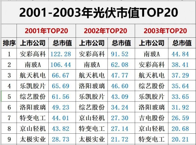 2001年,資本市場(chǎng)上只有約10家光伏上市公司,他們總市值合計(jì)為590億元,其中很多企業(yè)光伏業(yè)務(wù)占比都很小,都還算不上真正的光伏企業(yè)。
