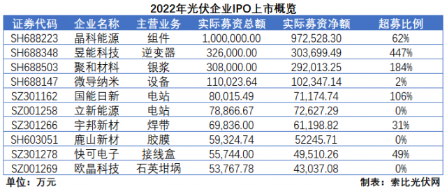 2022年,A股市場(chǎng)共有10家光伏企業(yè)完成IPO并成功上市,募資總額達(dá)到214.16億元,占A股市場(chǎng)5870億募資總額的比重為3.65%。值得一提的是,晶科能源募資總額高達(dá)100億元,是A股市場(chǎng)中僅有的五家達(dá)到百億級(jí)別的企業(yè)。此外,受益于廣闊的發(fā)展前景,機(jī)構(gòu)投資者對(duì)于光伏企業(yè)也頗為“慷慨”,像昱能科技、聚和材料超募比例分別達(dá)到447%和184%。