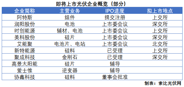 已經(jīng)到來(lái)的2023年,A股市場(chǎng)還將迎來(lái)更多重量級(jí)的光伏企業(yè)。其中,全球組件龍頭阿特斯已提交注冊(cè),電池片“龍三”潤(rùn)陽(yáng)股份、硅片新勢(shì)力美科股份已成功通過(guò)上市委會(huì)議,硅料巨頭新特能源已獲受理。此外,協(xié)鑫科技、高景太陽(yáng)能也已經(jīng)分別獲得董事會(huì)批準(zhǔn)和進(jìn)入輔導(dǎo)期。