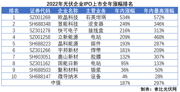 企業(yè)超募、股價(jià)暴漲、股民暴賺,這就是2022年成功登陸A股市場(chǎng)的10家光伏企業(yè)交出的“答卷”。而2023年,阿特斯、潤(rùn)陽(yáng)股份、美科股份、新特能源等一眾龍頭和新貴,也即將登陸A股市場(chǎng)。