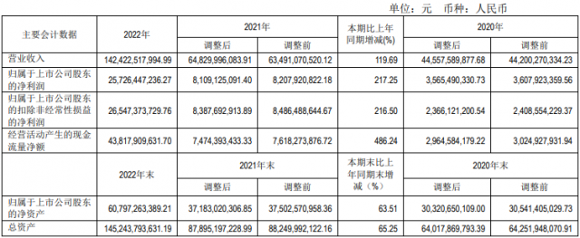 報告顯示,2022年,該公司實現(xiàn)營收、歸母凈利潤、扣非凈利潤分別為1424.23億元、257.26億元、265.47億元,同比分別增長119.69%、217.25%、216.50%。