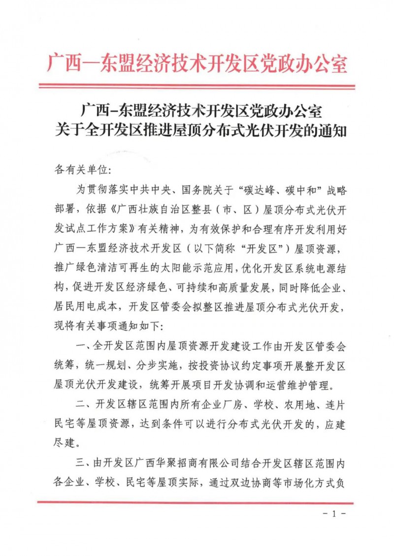 廣西-東盟經濟技術開發(fā)區(qū)黨政辦公室發(fā)布關于全開發(fā)區(qū)推進屋頂分布式光伏開發(fā)的通知。