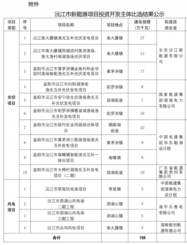 2月17日,湖南省沅江市人民政府下發(fā)《沅江市新能源項(xiàng)目投資開發(fā)主體比選結(jié)果公示》,共下發(fā)了1.58GW,包含1.38GW光伏項(xiàng)目、0.2GW風(fēng)電項(xiàng)目。