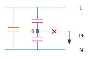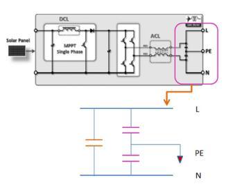 上圖中,L-PE以及N-PE間的電容被稱為Y電容,L-N間的電容被稱為X電容,X電容與Y電容也被叫做安全電容。做此設(shè)計的出發(fā)點,就是利用電容隔直通交的特性,把外界干擾和內(nèi)部產(chǎn)生的一些高頻輻射,通過電容——地線的路徑進(jìn)行濾除,從而增加逆變器的電磁兼容性。