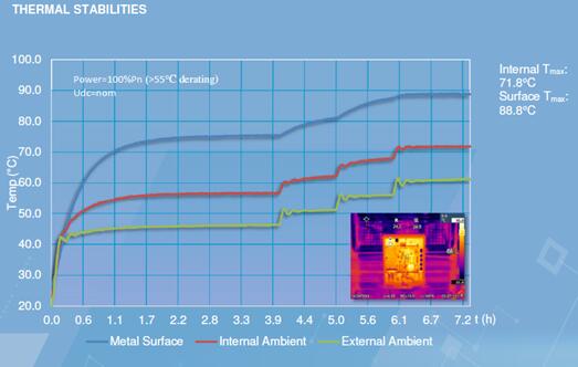 代表機型1:H廠商逆變器。逆變器內(nèi)部溫度與機箱外殼溫度一致,在環(huán)境溫度45度條件下,內(nèi)部溫度約55度;