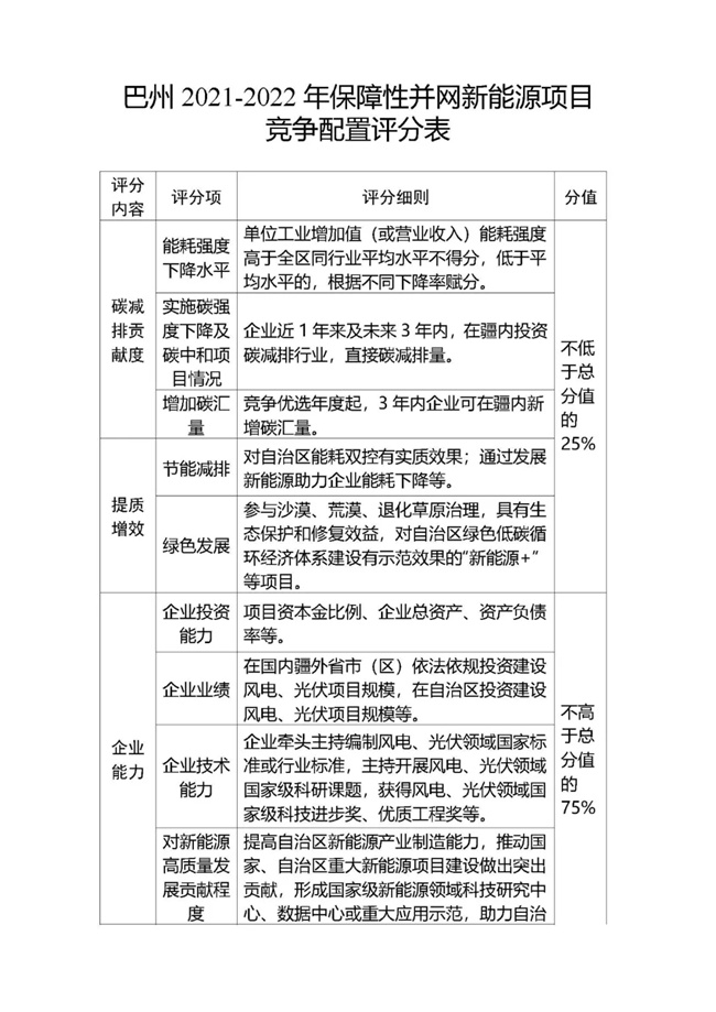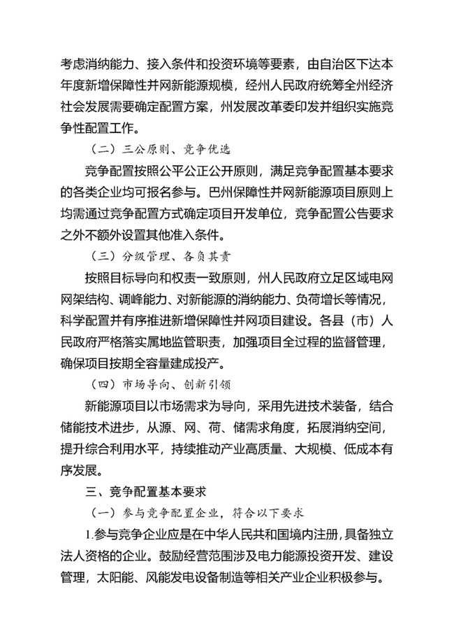 為貫徹落實(shí)碳達(dá)峰、碳中和任務(wù),持續(xù)推動(dòng)巴州風(fēng)電、光伏發(fā)電高質(zhì)量發(fā)展。按照《國家能源局關(guān)于2021年風(fēng)電、光伏發(fā)電開發(fā)建設(shè)有關(guān)事項(xiàng)的通知》(國能發(fā)新能〔2021〕25號(hào)) 《新疆維吾爾自治區(qū)火電和風(fēng)電、光伏等公共資源開發(fā)建設(shè)項(xiàng)目公開招標(biāo)選定業(yè)主暫行辦法》(自治區(qū)人民政府第201號(hào)令)《自治區(qū)發(fā)展改革委國家能源局新疆監(jiān)管辦關(guān)于2021年風(fēng)電、光伏發(fā)電年度開發(fā)建設(shè)方案有關(guān)事項(xiàng)的通知》(新發(fā)改能源〔2021〕419號(hào))等法律法規(guī)文件要求,現(xiàn)將巴州2021-2022年保障性并網(wǎng)新能源項(xiàng)目競爭性配置公開優(yōu)選業(yè)主工作公告如下: