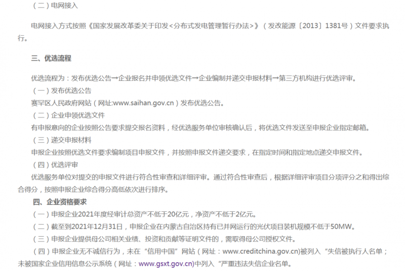 要求申報企業(yè)截至到2021年12月31日,在內蒙古自治區(qū)持有已并網運行的光伏項目裝機規(guī)模不低于50MW。