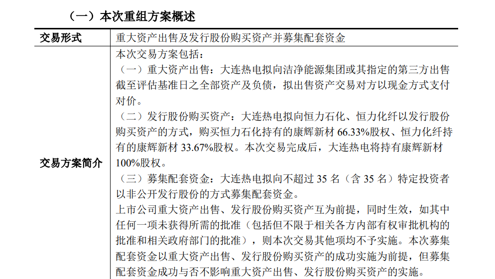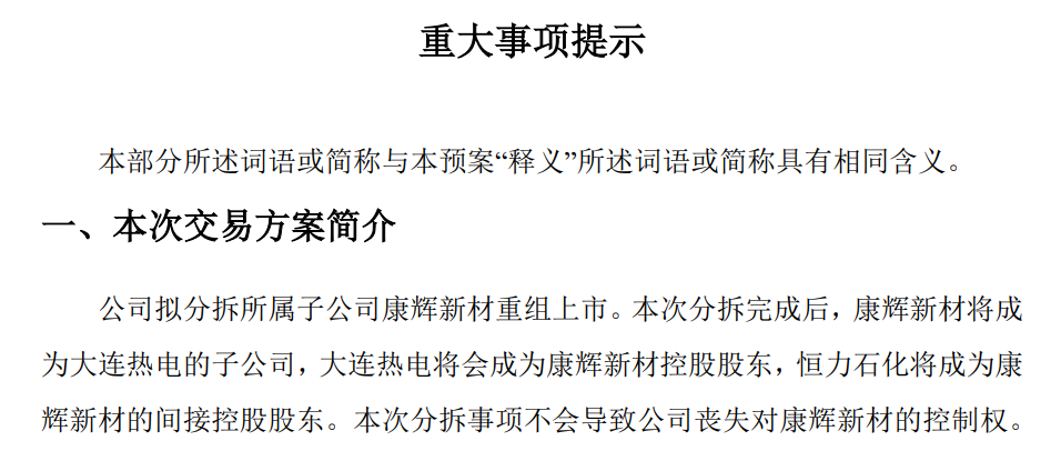 本次分拆完成后,大連熱電將會成為康輝新材的控股股東。其擬通過向康輝新材全體股東發(fā)行股份購買其合計持有的康輝新材100%股份,進而實現(xiàn)恒力石化分拆康輝新材重組上市。這在A股還是首次。