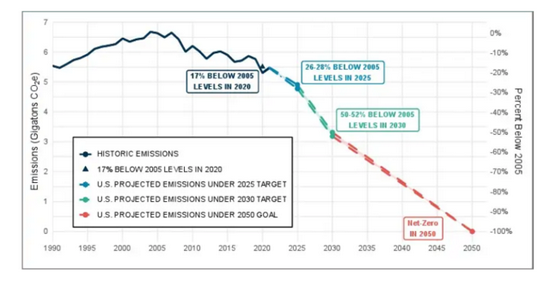 11月1日周一,白宮公布了到 2050 年實現(xiàn)“凈零”溫室氣體排放的戰(zhàn)略——根據(jù)該戰(zhàn)略,美國將努力消除或抵消所有氣候污染。此前,拜登曾在多次競選活動及上任后的發(fā)言中表示,保證到2030年將美國的溫室氣體排放量相對于2005年的水平減少50-52%,并在2050年之前實現(xiàn)凈零排放,而這個目標比當年奧巴馬政府高了一倍(2025年將排放量減少26-28%)。