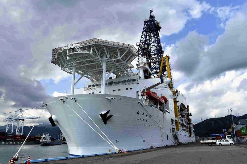 2018年10月,在靜岡清水港的地球深部探測(cè)船“地球”號(hào)(Chikyu)。 圖片來(lái)源:日本時(shí)報(bào)網(wǎng)站