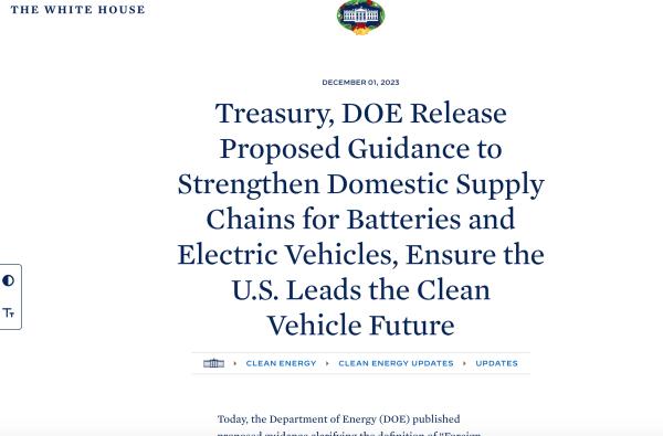 12月1日,美國能源部(DOE)發(fā)布《兩黨基礎(chǔ)設(shè)施法》中 “敏感外國實體(Foreign Entity of Concern,F(xiàn)EOC)”的解釋文件。同日,美國財政部(Treasury)和國稅局(IRS)發(fā)布了《通貨膨脹削減法》(IRA)第30D條清潔能源車輛稅收抵免相關(guān)禁令的指導(dǎo)意見。