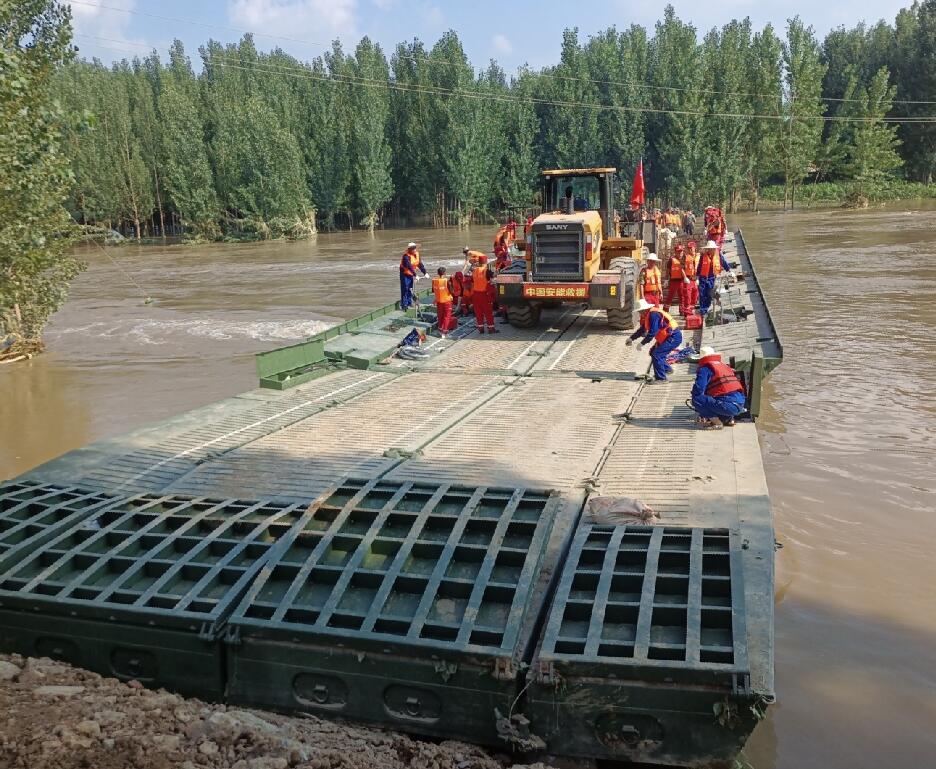 為了解決這個問題,安能三局用昨日在新鄉(xiāng)轉(zhuǎn)移被困群眾的應急動力舟橋,運輸挖掘機、推土機等大型裝備以及鋼筋籠和沙袋至決口右岸,今天又再一次立下大功。