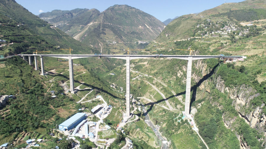 金陽河特大橋合龍段是大橋施工中技術(shù)難度大、安全風險高的一道關鍵工序,精度高,對環(huán)境溫度要求嚴格,需要在一天中氣溫最低時合龍。項目團隊先后攻克超高墩連續(xù)剛構(gòu)橋結(jié)構(gòu)設計、鋼管高空吊裝、超高超遠高性能混凝土泵送、超高塔吊電梯運行安全保障等關鍵難題,確保了工程安全、質(zhì)量、進度,節(jié)約了項目成本,推動了中國橋梁建設技術(shù)的長足進步。