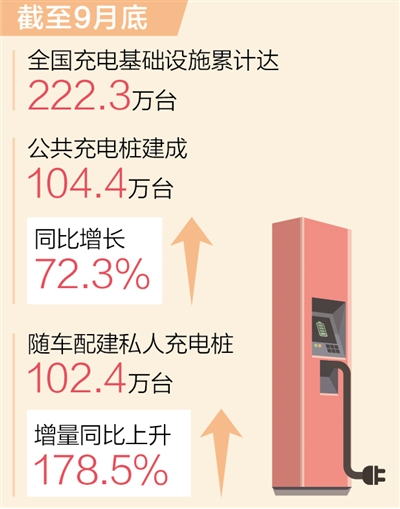 中國電動汽車充電基礎(chǔ)設(shè)施促進(jìn)聯(lián)盟最新數(shù)據(jù)顯示,截至9月,全國充電基礎(chǔ)設(shè)施累計達(dá)222.3萬臺,同比增長56.8%。我國已建成全球最大規(guī)模充電設(shè)施網(wǎng)絡(luò)。