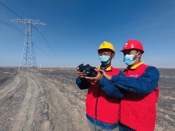 新疆送變電公司員工石浩、楊軍在±1100千伏吉泉線0339號(hào)塔開展保電巡視。蒲平 攝