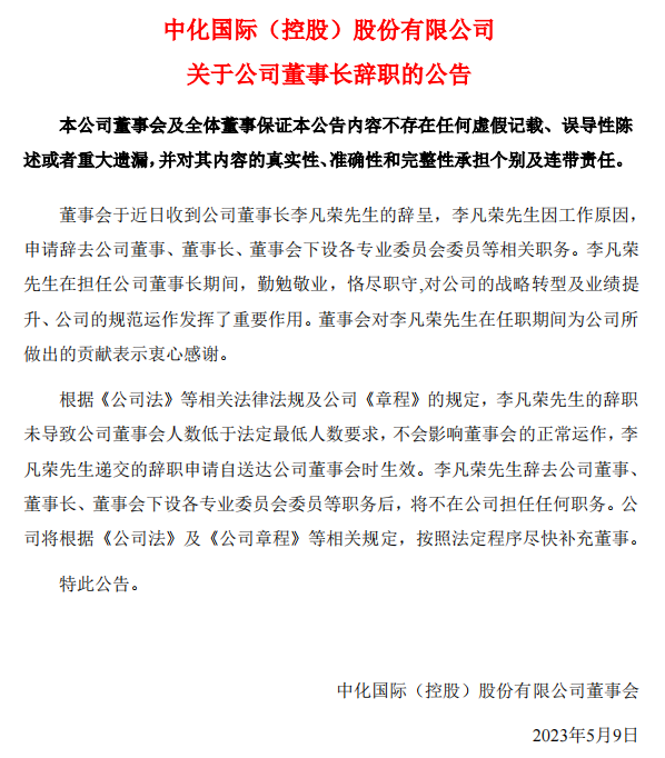 5月9日,中化國際(控股)股份有限公司(以下簡稱“中化國際”)發(fā)布公告,董事會(huì)于近日收到公司董事長李凡榮的辭呈,李凡榮因工作原因,申請(qǐng)辭去公司董事、董事長、董事會(huì)下設(shè)各專業(yè)委員會(huì)委員等相關(guān)職務(wù)。