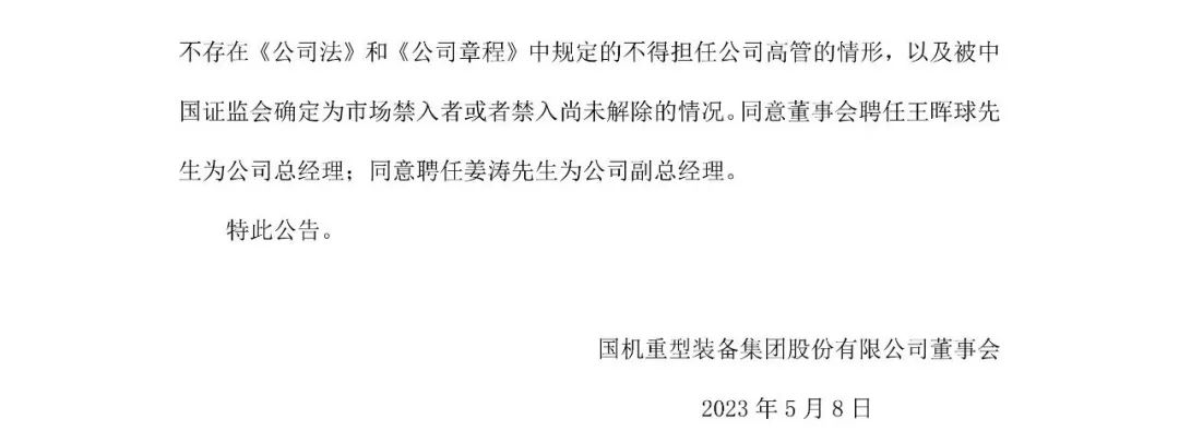 5月6日,國機重裝董事會審議通過了《關于聘任公司總經(jīng)理、副總經(jīng)理的議案》,同意聘任王暉球為公司總經(jīng)理;同意聘任姜濤為公司副總經(jīng)理。