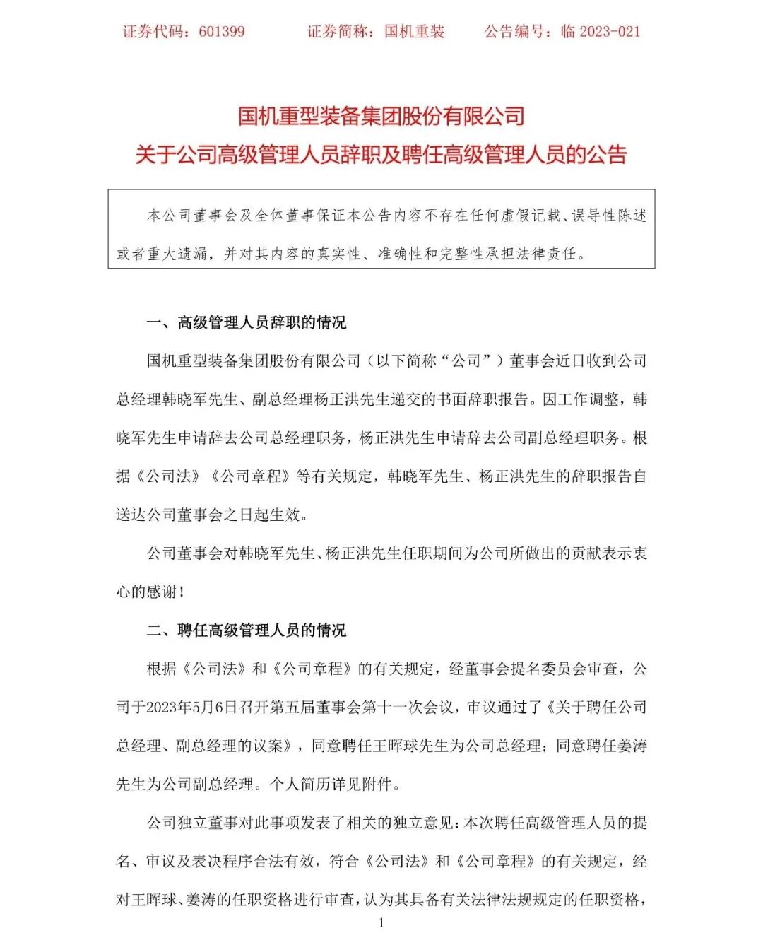 5月8日,國機重裝發(fā)布公告,董事會近日收到公司總經(jīng)理韓曉軍、副總經(jīng)理楊正洪遞交的書面辭職報告。因工作調(diào)整,韓曉軍申請辭去公司總經(jīng)理職務,楊正洪申請辭去公司副總經(jīng)理職務。