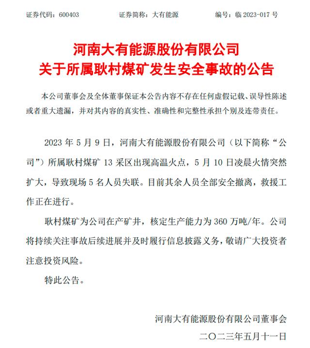 2023年5月9日,河南大有能源股份有限公司耿村煤礦13采區(qū)出現高溫火點,5月10日凌晨火情突然擴大,導致現場5名人員失聯。