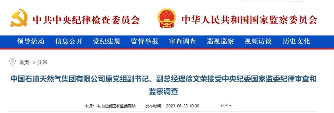 中央紀(jì)委國家監(jiān)委網(wǎng)站6月25日消息,中國石油天然氣集團(tuán)有限公司原黨組副書記、副總經(jīng)理徐文榮接受中央紀(jì)委國家監(jiān)委紀(jì)律審查和監(jiān)察調(diào)查。
