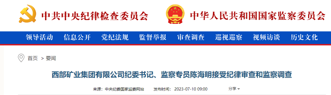 中央紀(jì)委國家監(jiān)委網(wǎng)站7月10日消息,據(jù)青海省紀(jì)委監(jiān)委消息:西部礦業(yè)集團(tuán)有限公司黨委委員、紀(jì)委書記、監(jiān)察專員,青海省紀(jì)委委員陳海明涉嫌嚴(yán)重違紀(jì)違法,目前正接受青海省紀(jì)委監(jiān)委紀(jì)律審查和監(jiān)察調(diào)查。