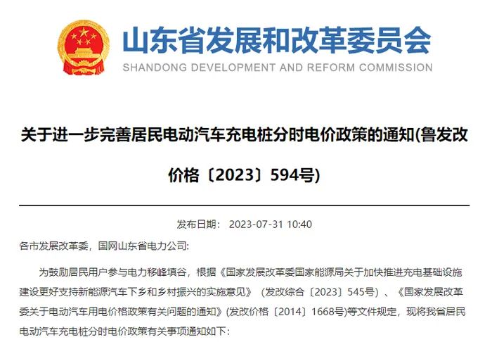 山東省發(fā)改委2023年7月31日發(fā)布《關(guān)于進(jìn)一步完善居民電動(dòng)汽車充電樁分時(shí)電價(jià)政策的通知》