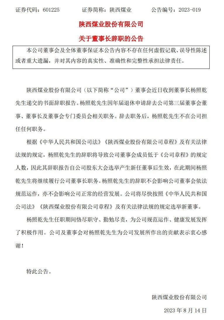 陜西煤業(yè)公告,公司董事會近日收到董事長楊照乾遞交的書面辭職報(bào)告。楊照乾因年屆退休申請辭去公司第三屆董事會董事、董事長及董事會專門委員會相關(guān)職務(wù)。