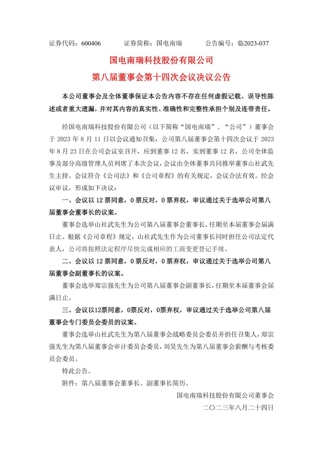 8月24日,國(guó)電南瑞發(fā)布公告稱,經(jīng)公司董事會(huì)于2023年8月11日以會(huì)議通知召集,公司第八屆董事會(huì)第十四次會(huì)議于2023年8月23日在公司會(huì)議室召開。