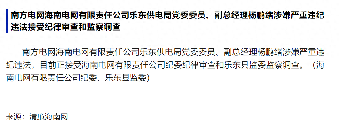 南方電網(wǎng)高層驚現(xiàn)腐敗風(fēng)暴!樂(lè)東供電局黨委委員、副總經(jīng)理?xiàng)铢i緒涉嫌違紀(jì)違法,正接受紀(jì)委和監(jiān)委的雙重調(diào)查!