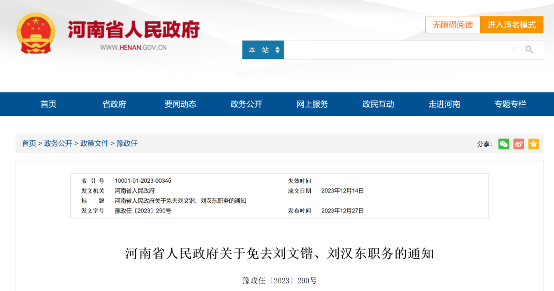 12月27日,河南省政府發(fā)布通知稱,免去劉文鍇的華北水利水電大學(xué)校長職務(wù);免去劉漢東的華北水利水電大學(xué)副校長職務(wù)。