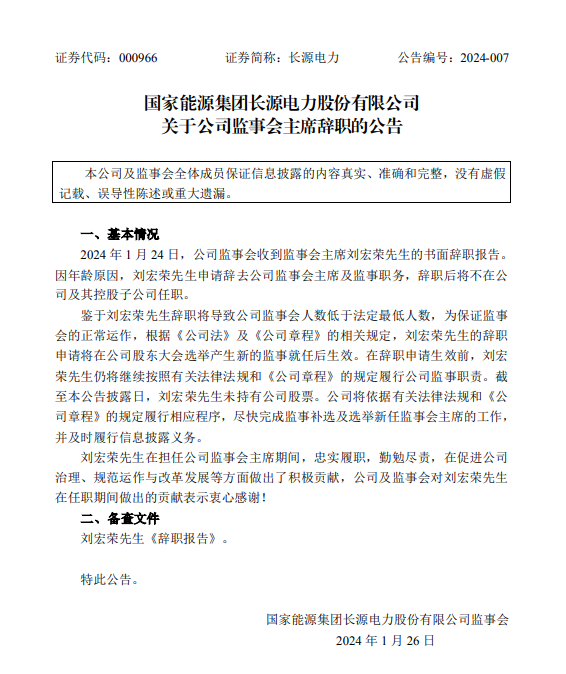 1月26日,長源電力發(fā)布公告稱,1月24日,公司監(jiān)事會收到監(jiān)事會主席劉宏榮先生的書面辭職報(bào)告。因年齡原因,劉宏榮先生申請辭去公司監(jiān)事會主席及監(jiān)事職務(wù),辭職后將不在公司及其控股子公司任職。