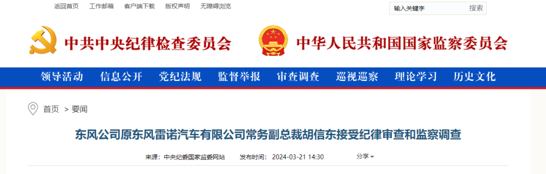 中央紀(jì)委國家監(jiān)委網(wǎng)站3月21日,據(jù)東風(fēng)公司紀(jì)委、湖北省紀(jì)委監(jiān)委消息:東風(fēng)公司原東風(fēng)雷諾汽車有限公司常務(wù)副總裁胡信東涉嫌嚴(yán)重違紀(jì)違法,目前正在接受東風(fēng)公司紀(jì)委和湖北省襄陽市監(jiān)委紀(jì)律審查和監(jiān)察調(diào)查。
