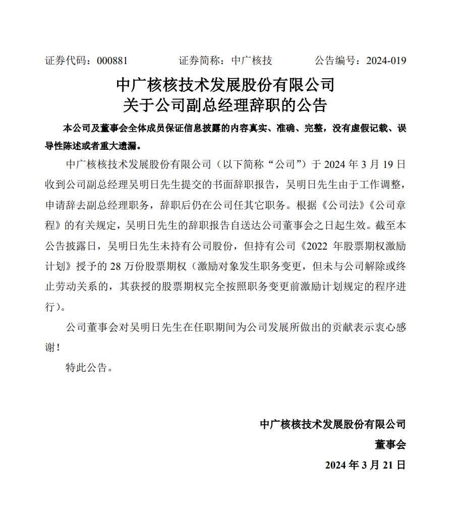 3月21日,中廣核技發(fā)布公告稱,公司于3月19日收到公司副總經(jīng)理吳明日先生提交的書面辭職報(bào)告,吳明日先生由于工作調(diào)整,申請(qǐng)辭去副總經(jīng)理職務(wù),辭職后仍在公司任其它職務(wù)。