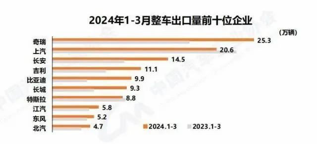 2024年一季度汽車(chē)出口數(shù)據(jù)。數(shù)據(jù)來(lái)源:中國(guó)汽車(chē)工業(yè)協(xié)會(huì)