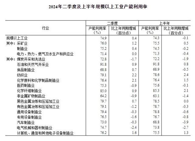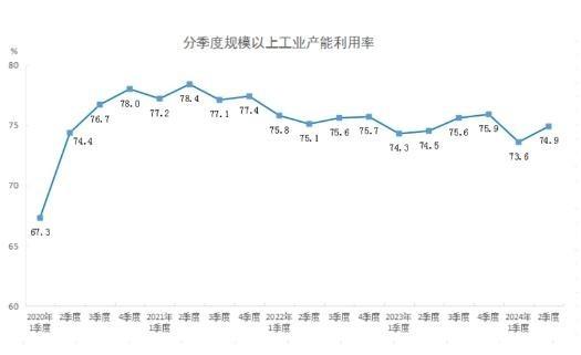 據(jù)國家統(tǒng)計(jì)局網(wǎng)站消息,2024年二季度,全國規(guī)模以上工業(yè)產(chǎn)能利用率為74.9%,比上年同期上升0.4個百分點(diǎn),比一季度上升1.3個百分點(diǎn)。
