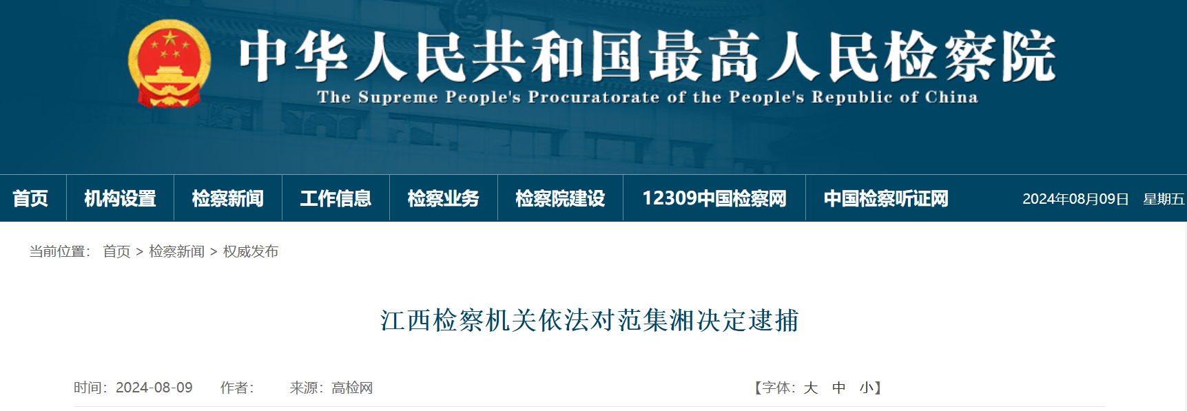 中國(guó)電力建設(shè)集團(tuán)有限公司原黨委副書(shū)記、董事長(zhǎng)范集湘涉嫌受賄、利用影響力受賄一案,由江西省監(jiān)察委員會(huì)調(diào)查終結(jié),移送檢察機(jī)關(guān)審查起訴。日前,經(jīng)最高人民檢察院指定管轄,江西省南昌市人民檢察院依法以涉嫌受賄罪、利用影響力受賄罪對(duì)范集湘作出逮捕決定。案件正在進(jìn)一步辦理中。