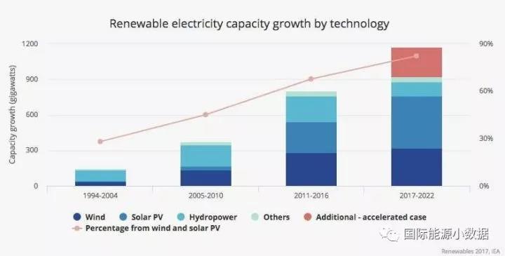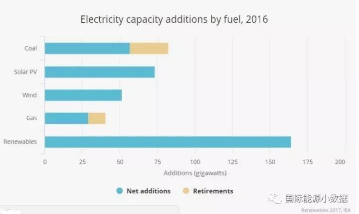 國(guó)際能源署發(fā)布2017年可再生能源報(bào)告,確認(rèn)2016年全球新增可再生能源裝機(jī)165吉瓦,其中太陽(yáng)能光伏裝機(jī)達(dá)到74吉瓦(約46%來自中國(guó)),首次超過煤電新增裝機(jī)(57吉瓦)。